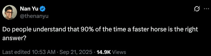 Sometimes a faster horse is the answer. Progress doesn’t always mean reinvention. Sometimes it’s a 10x upgrade of what already works.