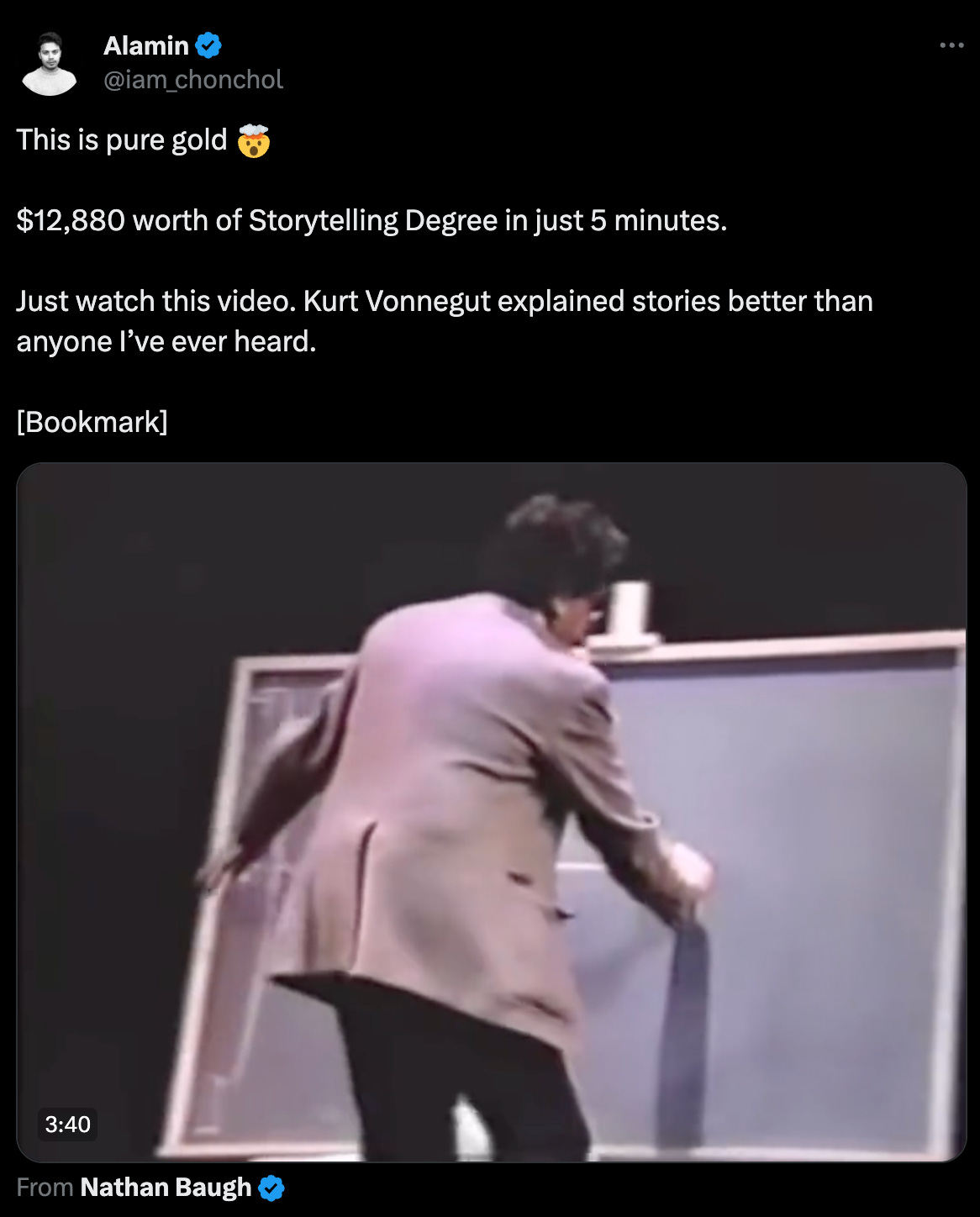 Learn storytelling in 4m (link). Kurt does an amazing job keeping you engaged through a simple story.