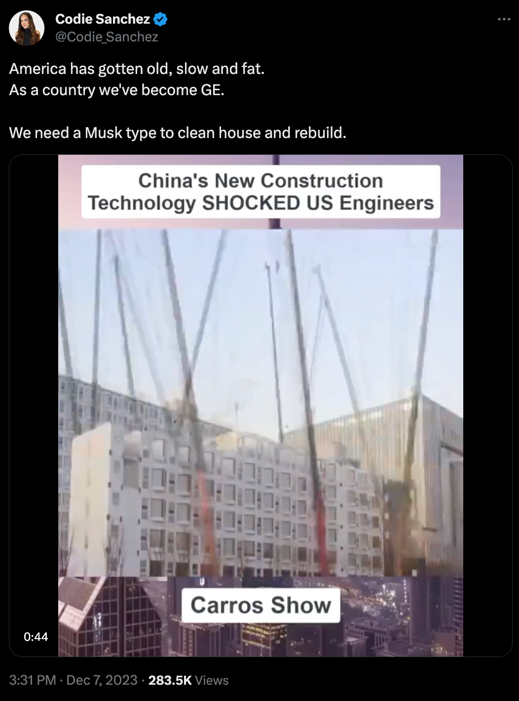 Back to my quote for this newsletter, America has become complacent (and also just bogged down). Take a look at this quick video of China modularly creating an apartment building (link).